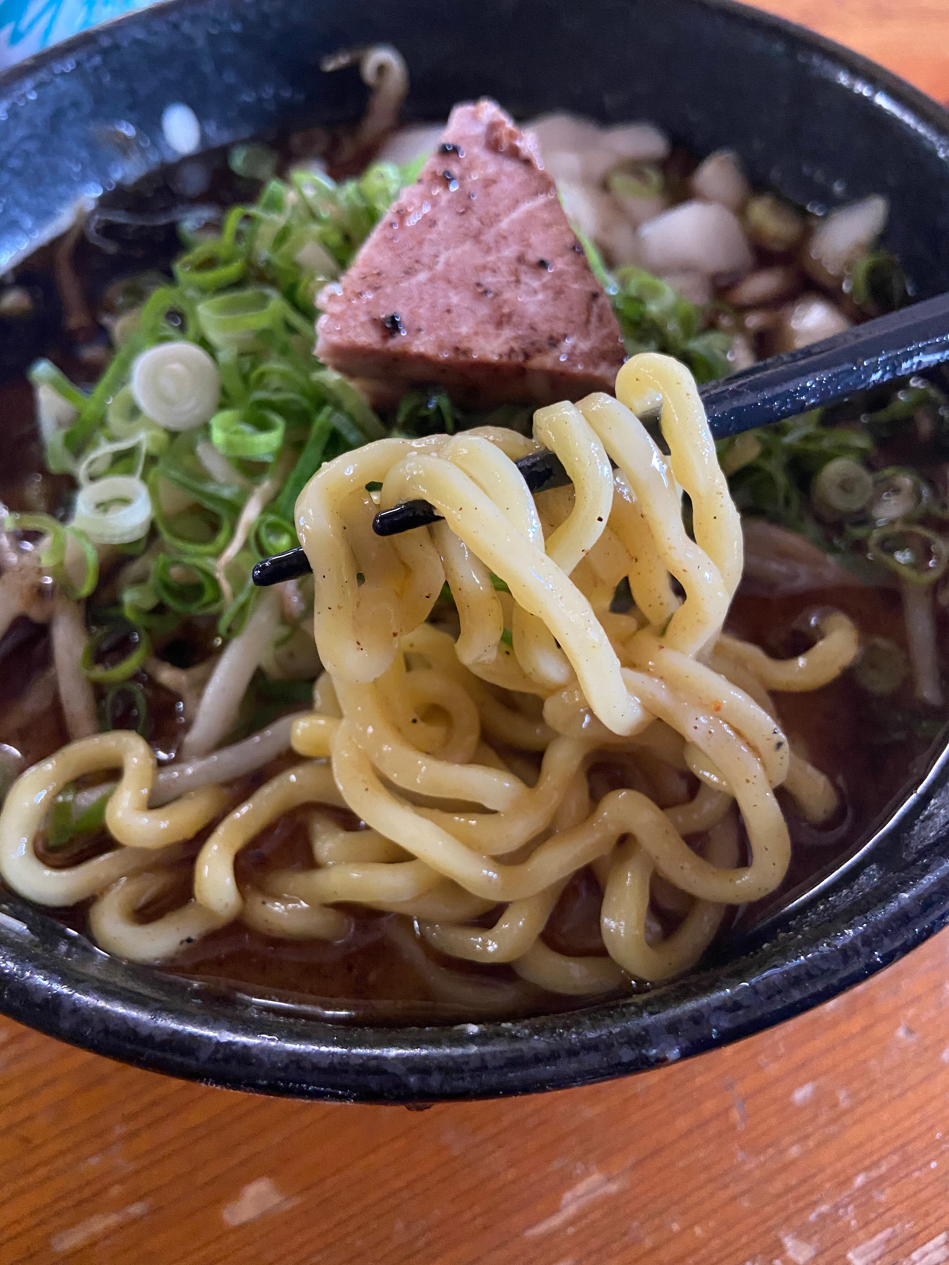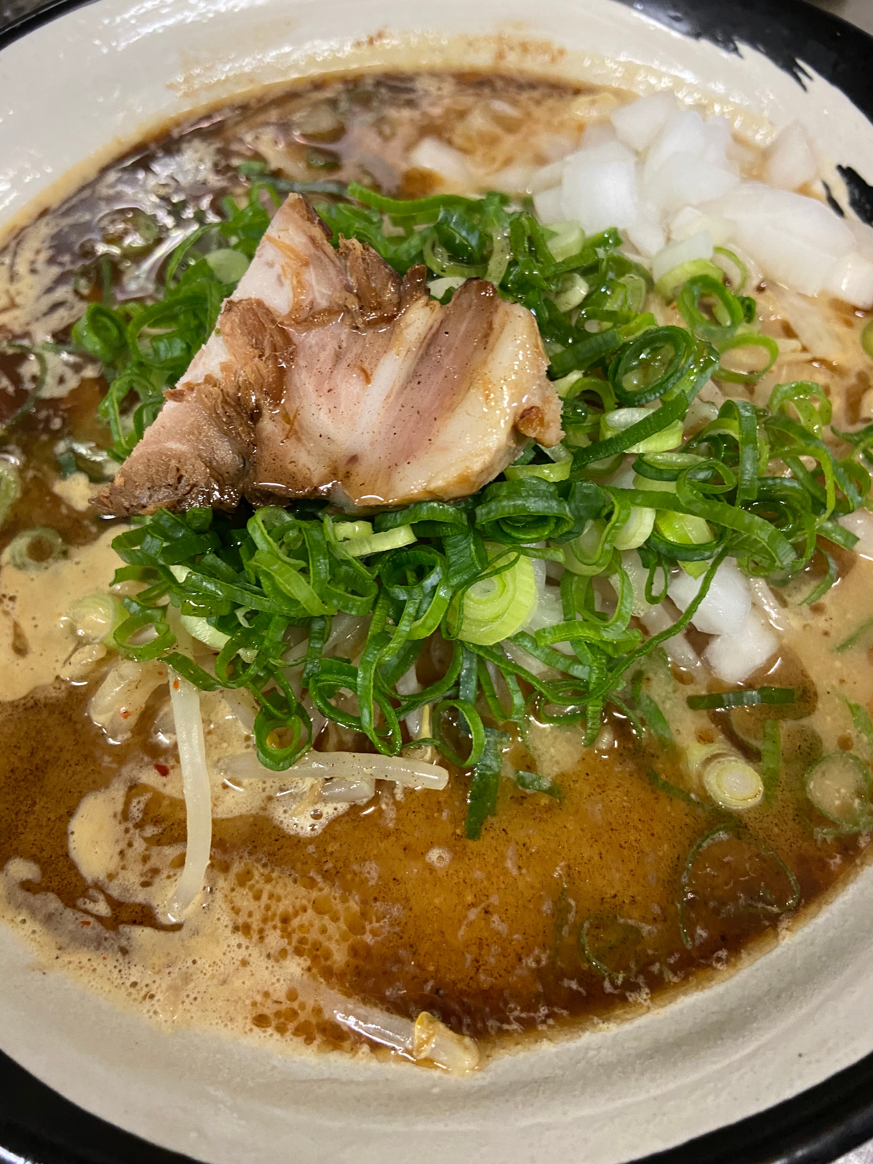 このセットは、味噌だれ、マー油入りスープと麺、スライスチャーシュー3枚がセットになっていますが、お店では味噌だれ入りのスープに、もやしを入れて一煮立ちさせたものを、茹でて丼に入れた麺の上に注ぎ、きざみねぎ、粗く刻んだ玉ねぎを添えてチャーシューをぶつ切りにしたものをトッピングにしています。